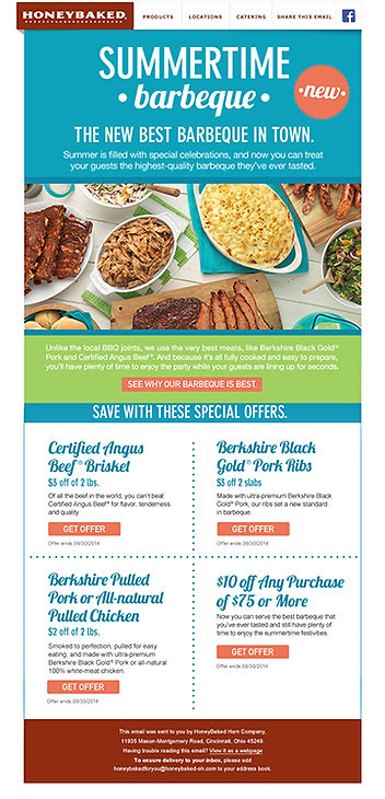 Everyone loves HoneyBaked Ham for special holidays like Christmas and Easter, but summer is generally a slow period for the company. The Summertime Barbeque line was designed to fill that seasonal void. This multi-piece collateral campaign consisted of postcards, t-shirts, a microsite, in-store materials and newspaper FSI's. The bright colors reflected the fun and joy of summer and helped to showcase the delicious food that was ready to fulfill all of the customer's summertime needs.